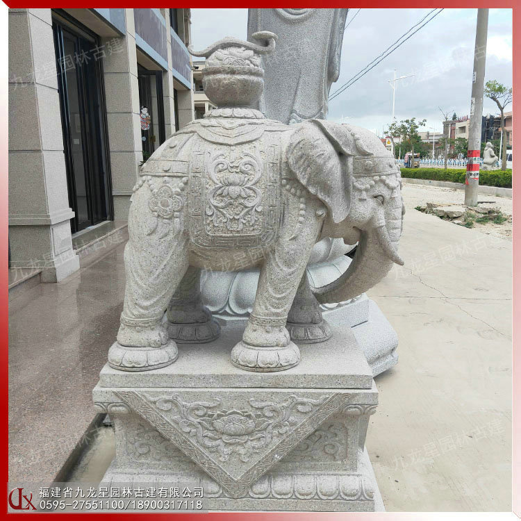 相傳佛教的創(chuàng)始人釋迦牟尼降臨世間時,是以一頭六牙白象的身份進入其母體內(nèi),經(jīng)懷胎十月后降臨人世間。這典故雖然無法驗證真?zhèn)?但在千年的歷史變遷中是受佛教信徒們最信任的一種說法,也因此大象與佛教寺院有著頗深的淵源。寺廟大門前擺放的石雕大象一般為六牙象,身上雕刻具有寺院或佛教代表寓意的圖案,擺放在山門前面或是寺院大殿入口處。大象是佛教中的神獸,除了可以很好地裝飾整座寺廟門面,還可以為過往上香的人們帶來吉祥平安。